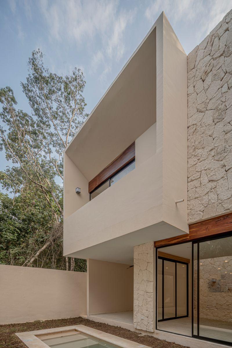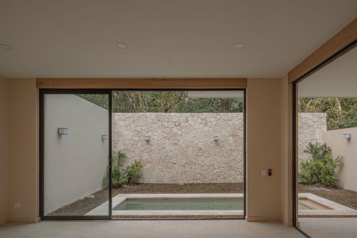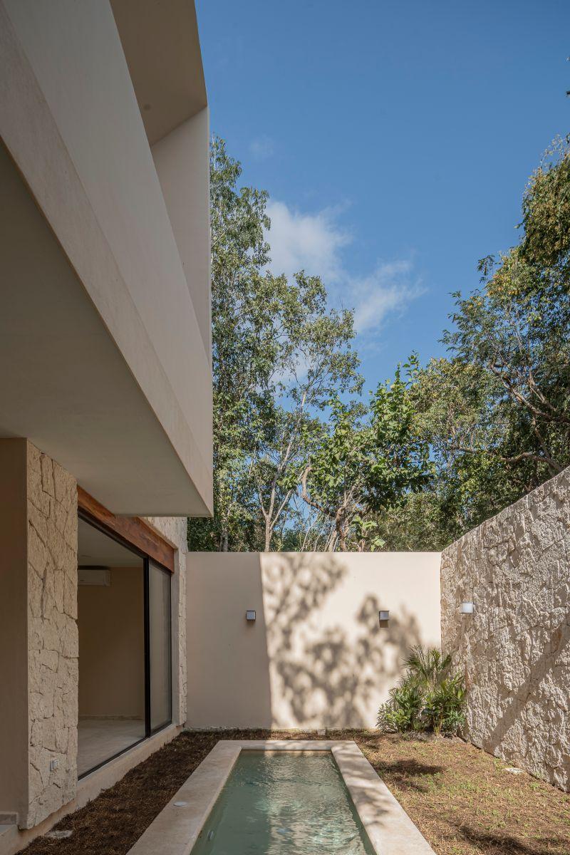Vive en Playa del Carmen: casa de 3 recámaras con baño, terraza conectada a alberca, cocina integrada y family room; acabados premium de piedra y madera.