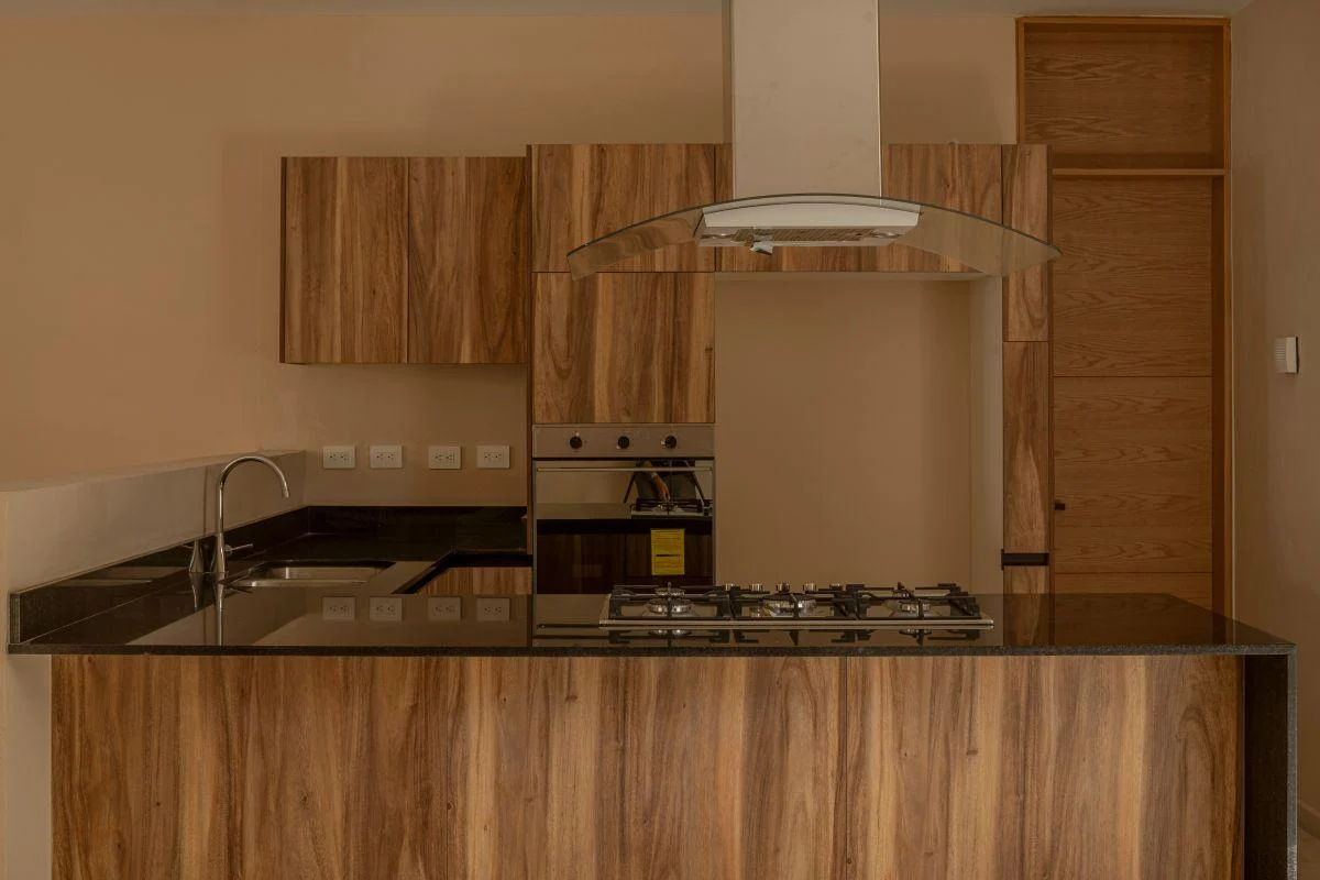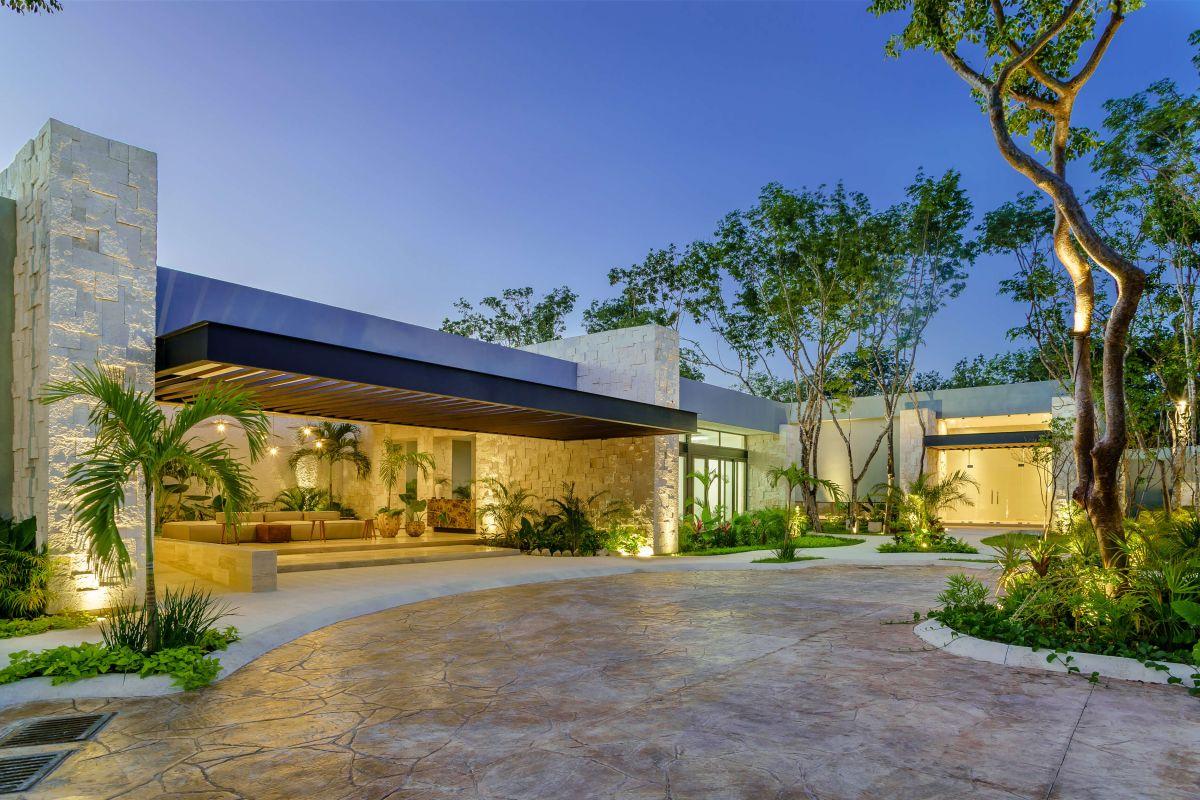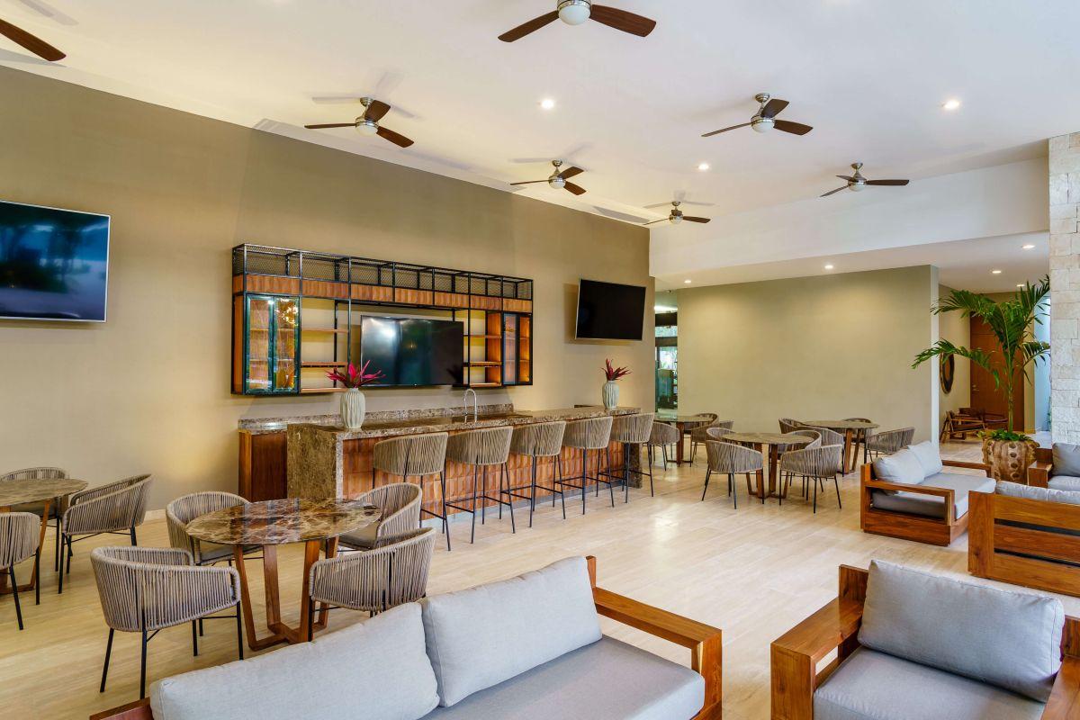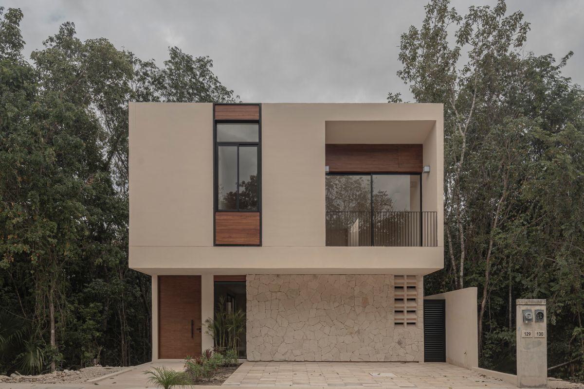 Vive en Playa del Carmen: casa de 3 recámaras con baño, terraza conectada a alberca, cocina integrada y family room; acabados premium de piedra y madera.